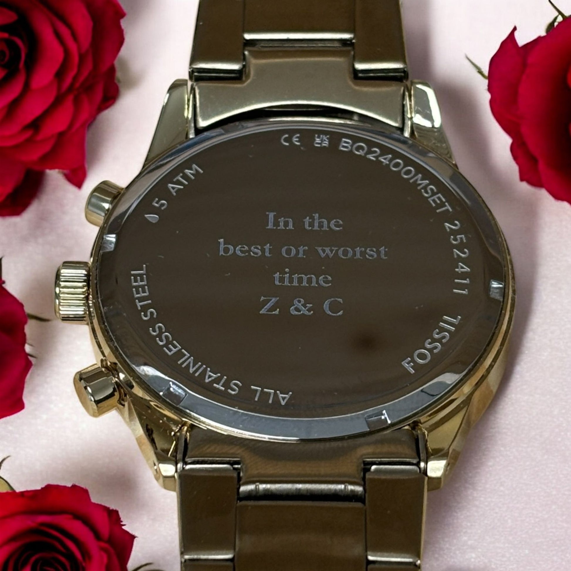 Please note that engraving is permanent and cannot be removed or altered once completed. Additionally, we cannot engrave watches that have sensors on the back, as the laser may cause damage.