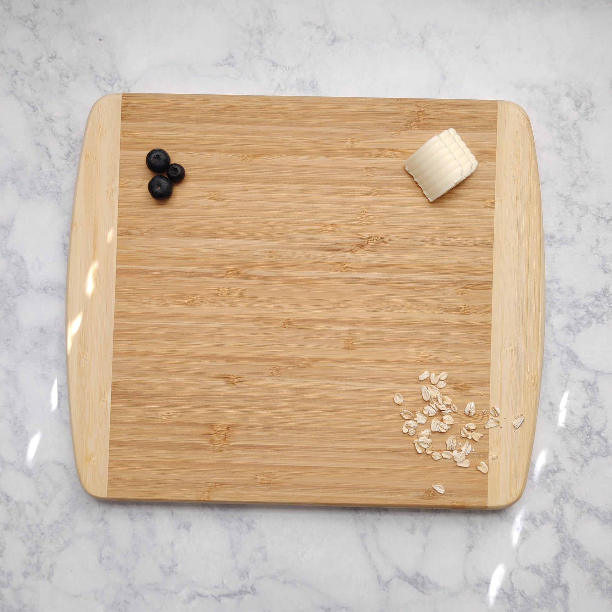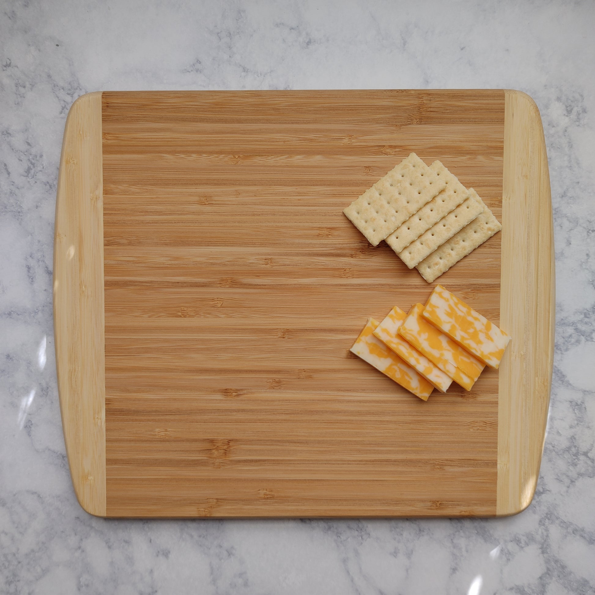 The cutting board is made of bamboo. It is well made and sturdy. Whether you need a gift for a grandparent, parent, teacher or friends, this board can be customized for your recipient. This extra large custom board is versatile and can be used as a cutting board, serving board, charcuterie board or cheese board! Size of this board is 13 1/2" x 11 1/2" x 3/4" thick.