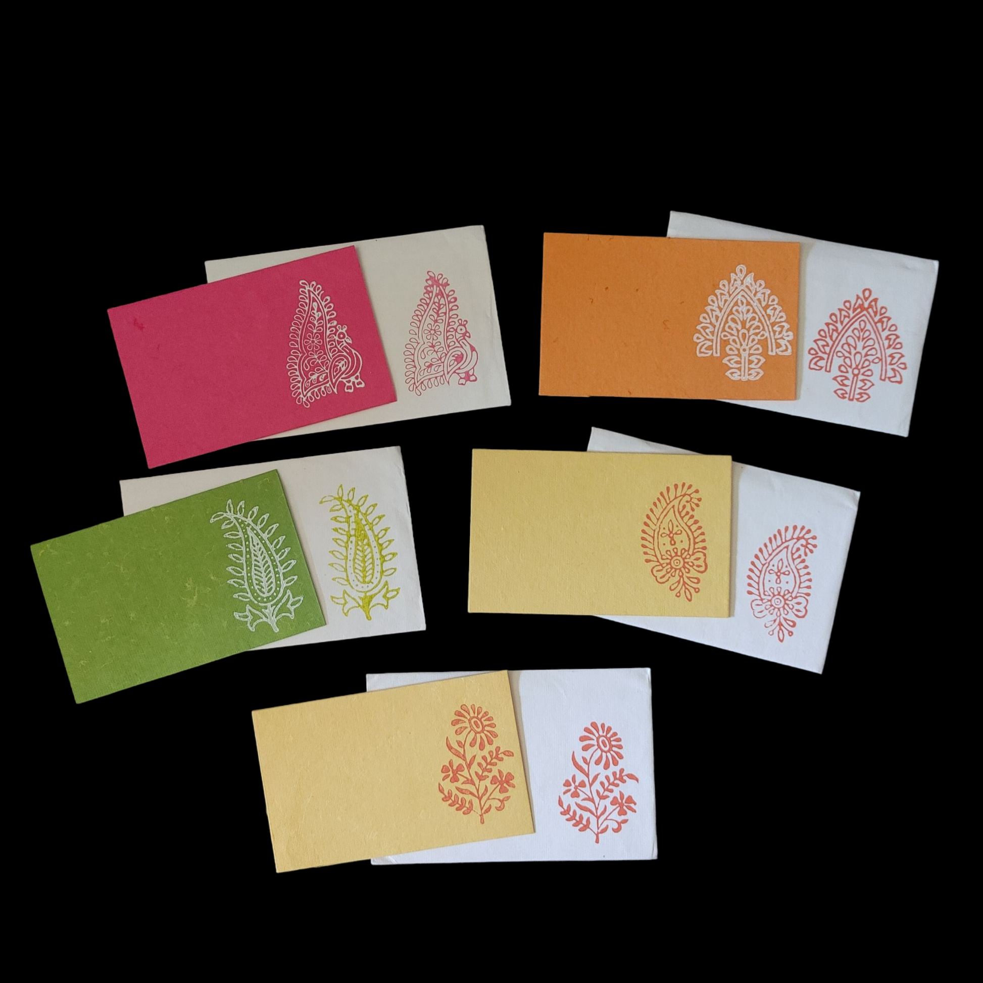 Each set has an assortment of 5 different cards of 5 different colors. The card and corresponding envelope are uniquely stamped with block print motifs inspired by traditional Indian designs, bringing a timeless elegance and cultural richness to every note.