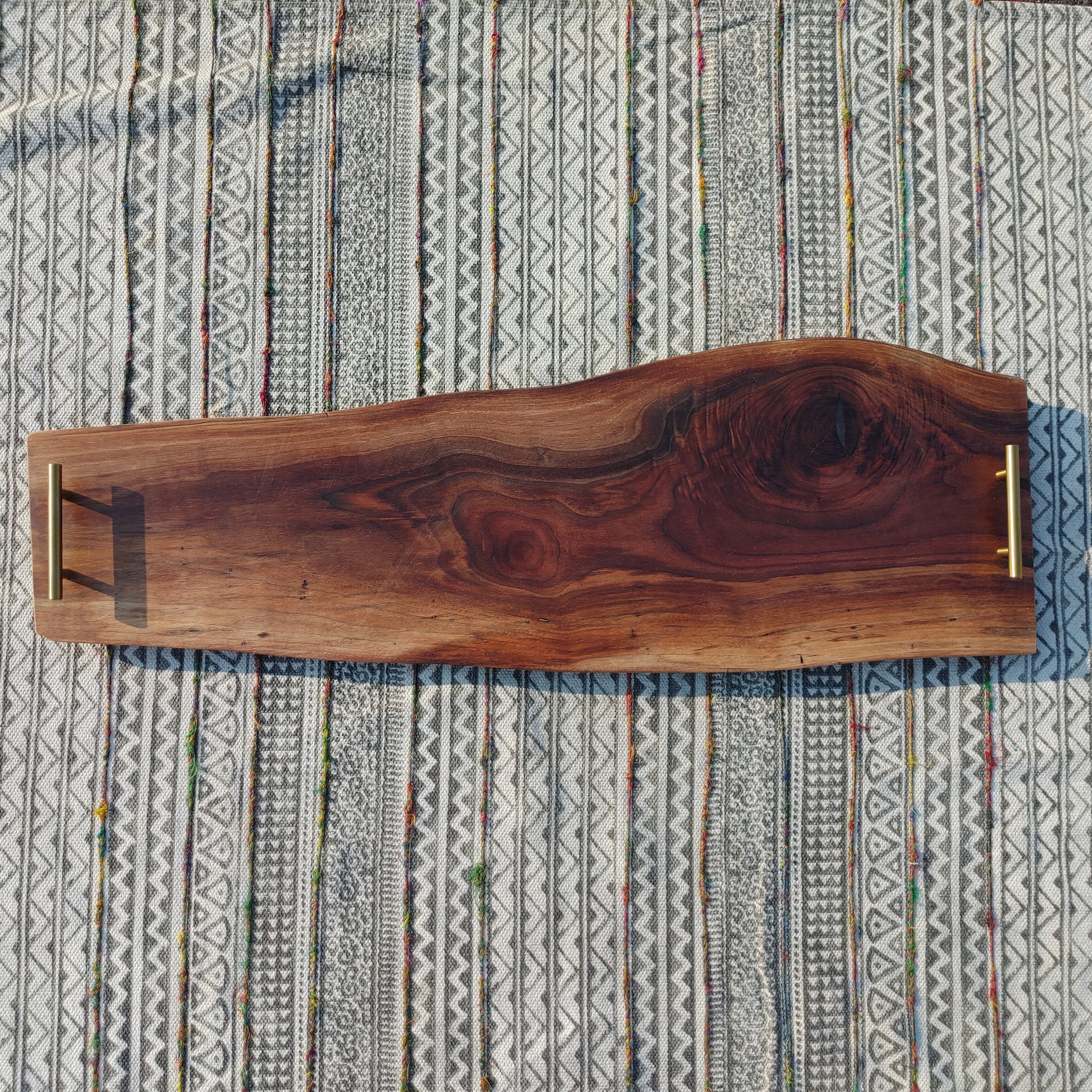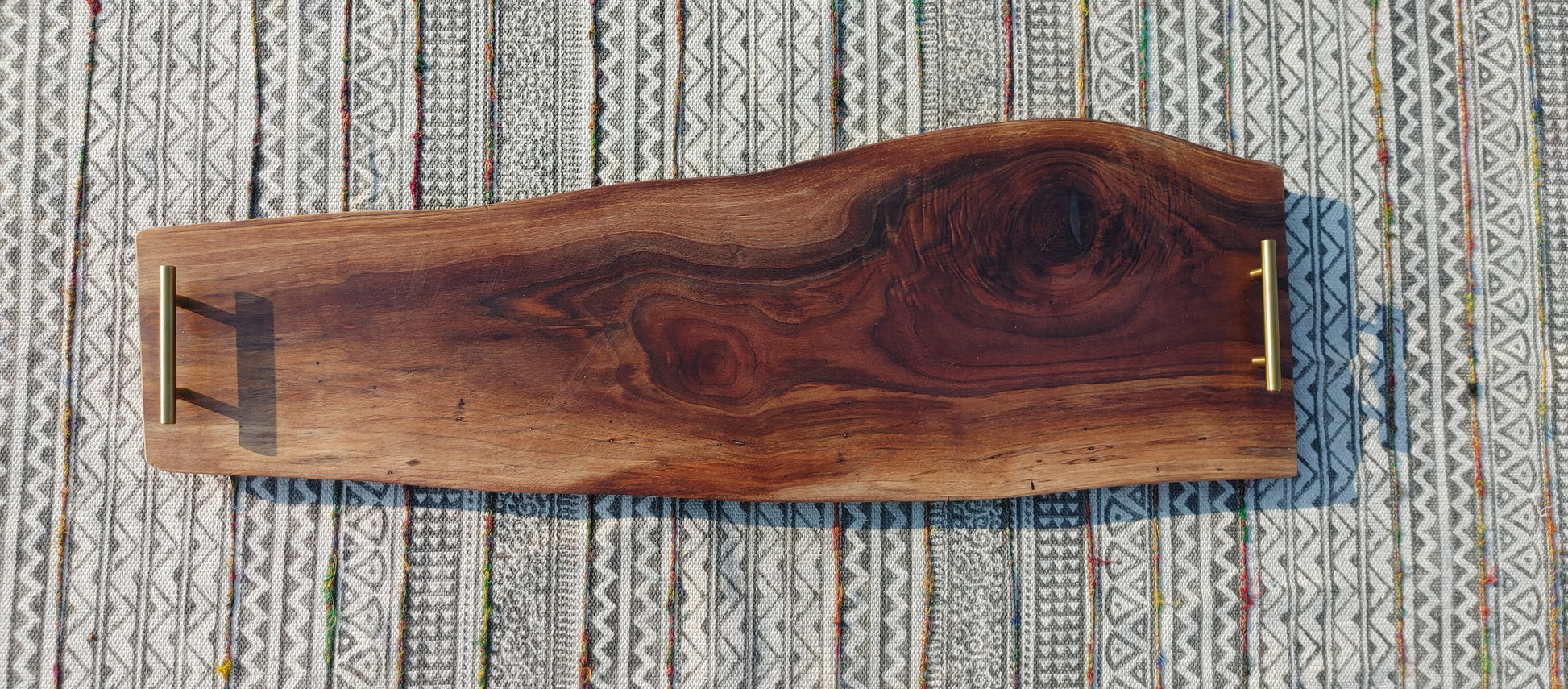 This extra large board is handcrafted from live edge black walnut wood and sealed with food safe oil. Brass handles are included for ease of use.