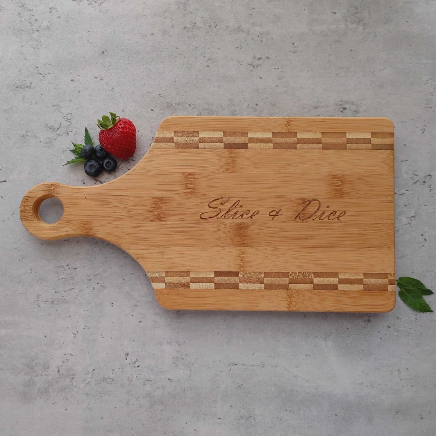 Paddle shaped Bamboo Board Cutting Board Engraved "Slice & Dice"