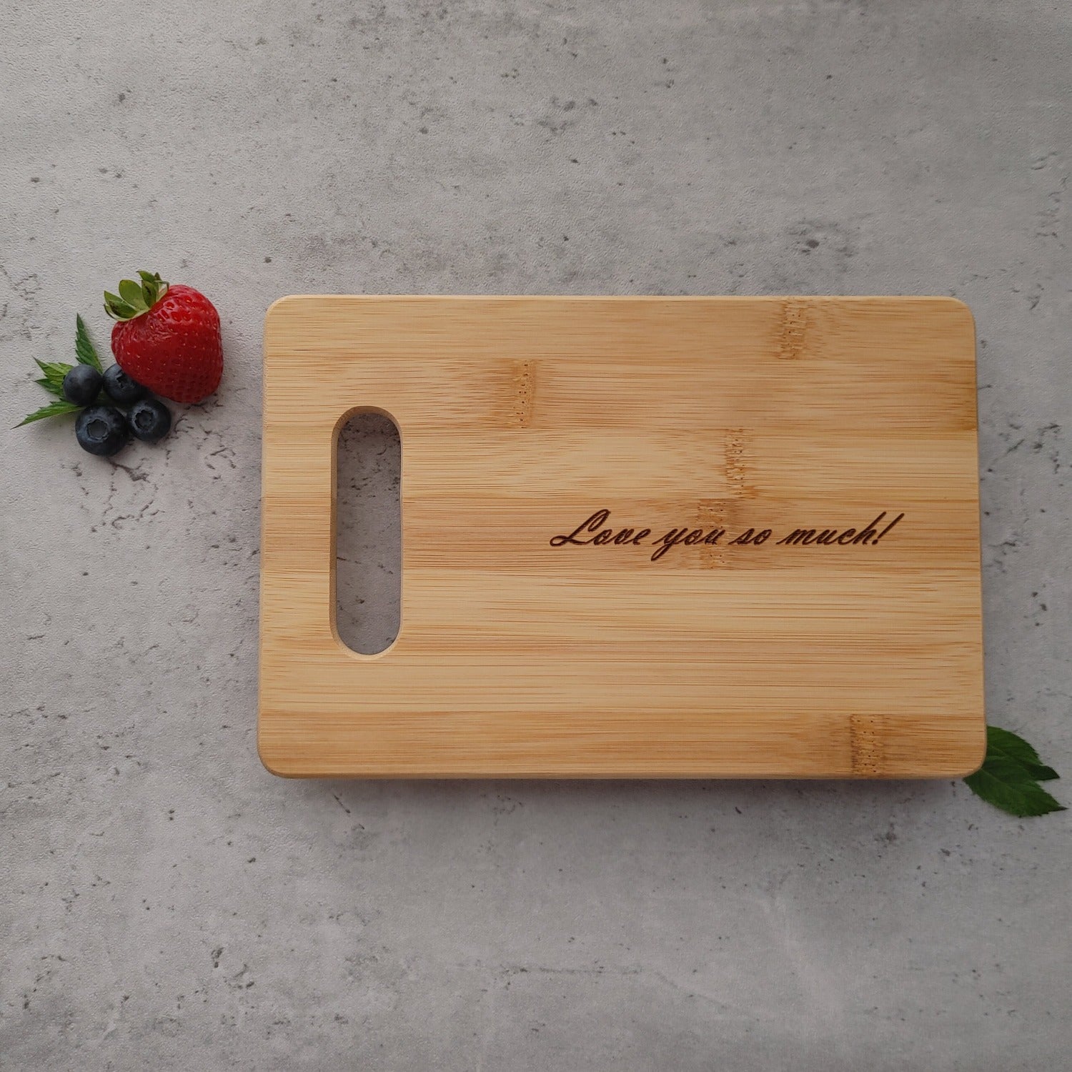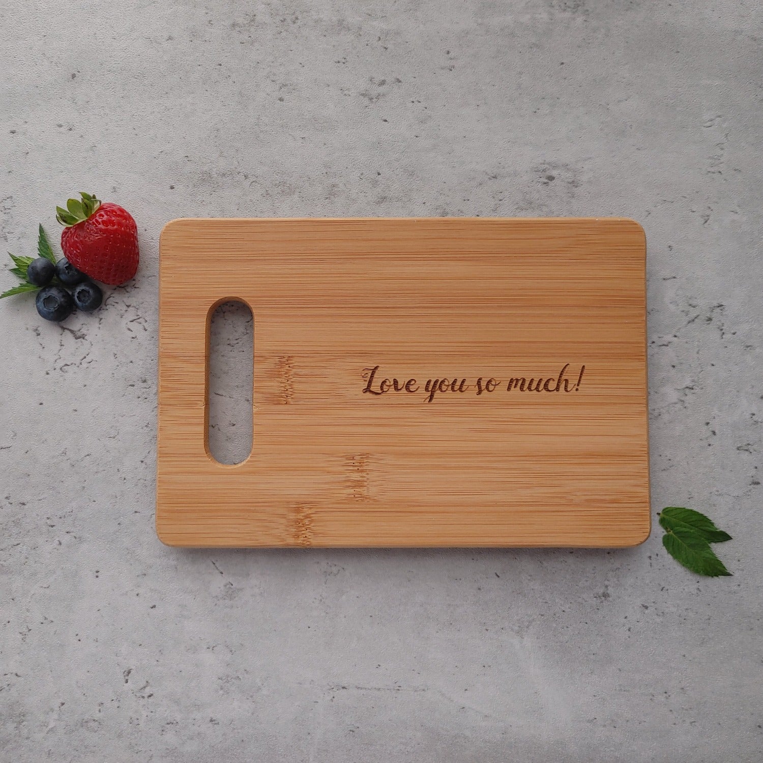 Small 9x6" bamboo board, engraved with an endearing message for your loved one! Perfect as a mini cheeseboard or serving tray or as a cutting board.